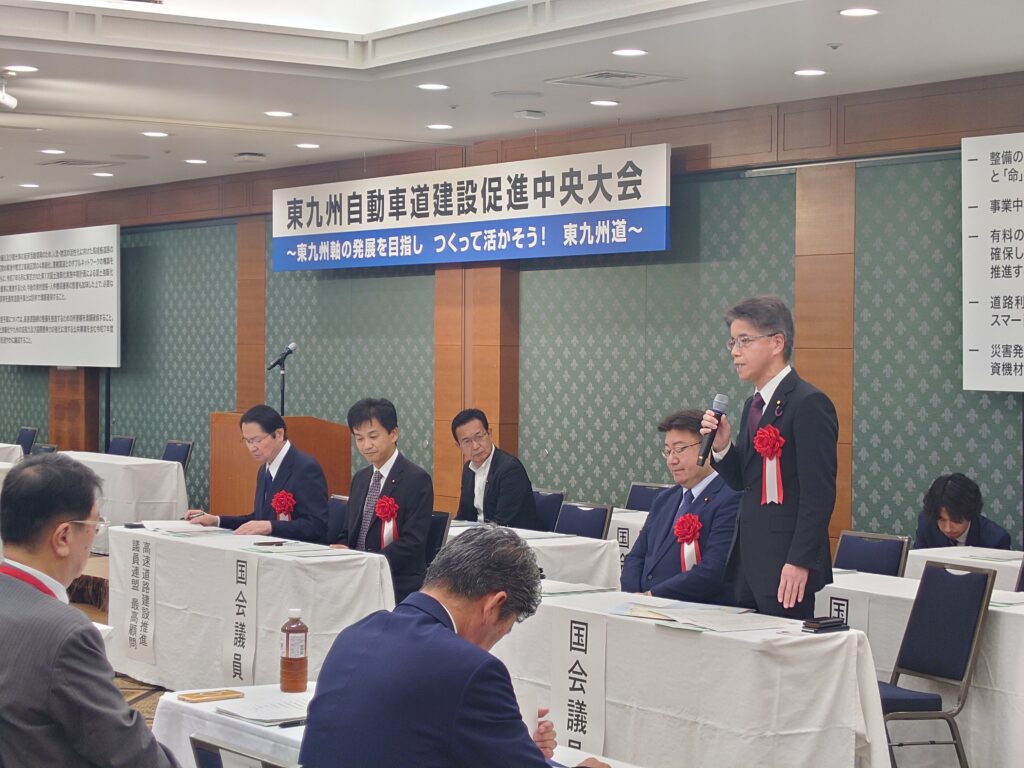 令和7年10月17日(金)、東京で開催された東九州自動車道建設促進中央大会に出席しました。来賓としてご挨拶させていただき、4車線化を含めた整備促進と予算確保の必要性についてお話ししました。一日も早い全線開通と4車線化の完成に向けて尽力してまいります。