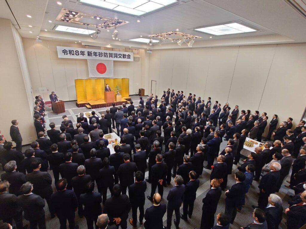 令和8年1月6日(火)、東京で開催された「令和8年新年砂防賀詞交歓会」にお招きいただき、来賓としてご挨拶させていただきました。その後、ご出席の砂防団体関係者約250名の方々と懇談をさせて頂きました。