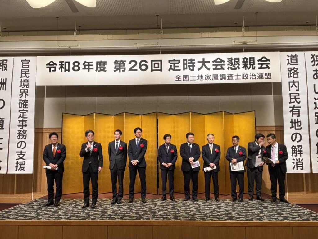令和8年3月17日(火)、東京で開催された「全国土地家屋調査士政治連盟第26回定時大会懇親会」に出席し、来賓としてご挨拶させていただきました。その後、ご出席の皆様と懇談をさせていただきました。